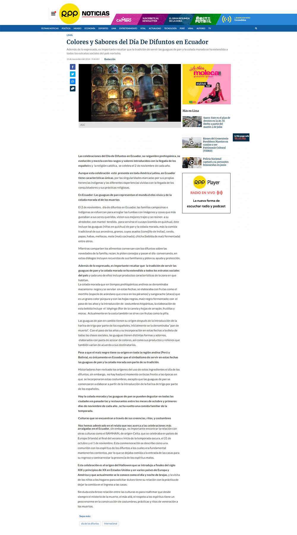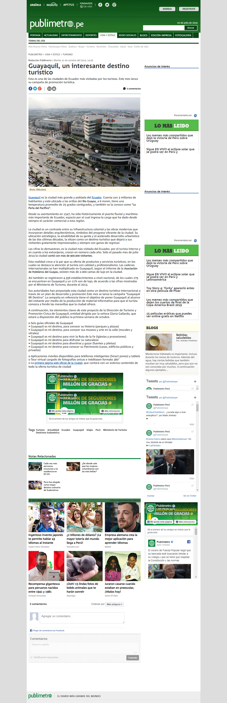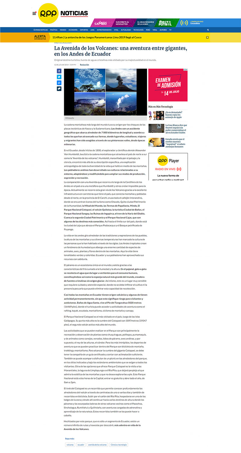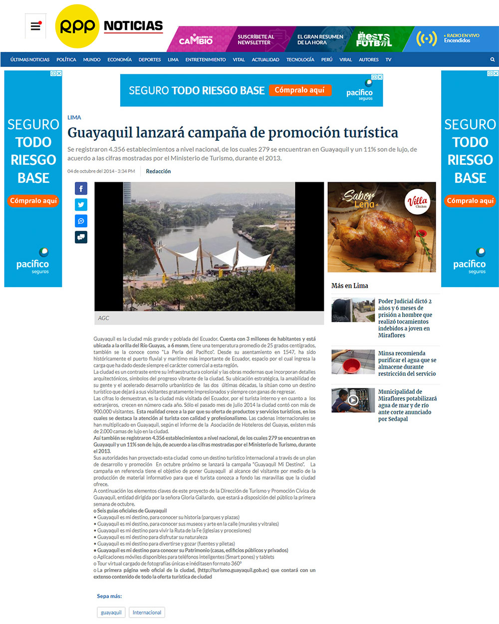 Corporación Ekos con el fin de potenciar el destino turístico en Ecuador, bajo el nombre All you need is Ecuador, y con el respaldo del Ministerio de turismo en Ecuador, logramos generar notoriedad en los medios de prensa en PERU mediante la promoción de marca país de Ecuador y dar a conocer sus destinos turísticos.